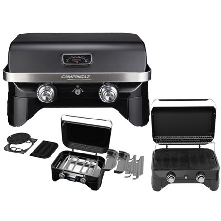 Potenza 5 kw, accensione elettronica, superficie di cottura in ghisa smaltata 58x36 cm., griglia/piastra reversibile, bruciatori in acciaio inox, coperchio con termostato, vassoio raccogli-grasso, scaldavivande, componenti lavabili in lavastoviglie. Dimen