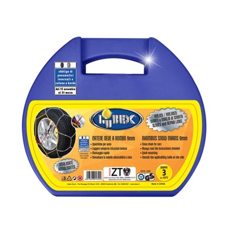 CATENE A ROMBO IN ACCIAIO, MAGLIA 9 MM. - SPESSORE 3 MM., DI FACILE MONTAGGIO. ADATTE PER VETTURE CON ABS E PNEUMATICI RIBASSATI. PRODOTTO CERTIFICATO GS-TUV. OMOLOGATE ONORM V5117 (OMOLOGAZIONE AUSTRIACA SPECIFICA PER AUTOVEICOLI M1, N1, O1, O2) PER OGNI