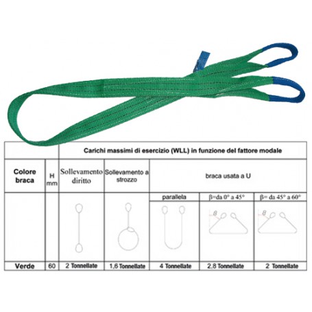 Nastro in poliestere H 60 mm., colore verde. Portata 2000 Kg. Asole rinforzate con protezioni antusura: Asola ripiegata 1/2 larghezza da un lato. Prodotto secondo Norma UNI EN 1492-1. Collaudo in base a specifiche e regole interne in riferimento alla norm
