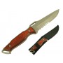 Lama fissa in acciaio 135 mm., dentatura 45 mm. nella parte finale della lama, manico in legno, fornito di fodera da cintura. Lunghezza totale 275 mm. Confezione in scatola