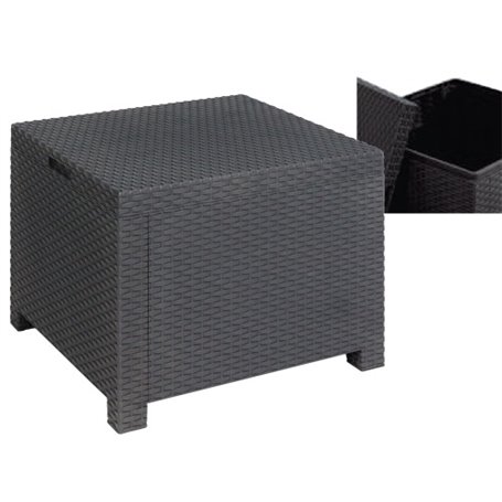 Struttura in resina inalterabile, resistente al gelo e alle intemperie ed ai raggi UV, maniglie per un comodo trasporto, facile montaggio ad incastro. Finitura effetto rattan. Dimensioni L59xP59xH45 cm. - Lt. 130. Colore antracite