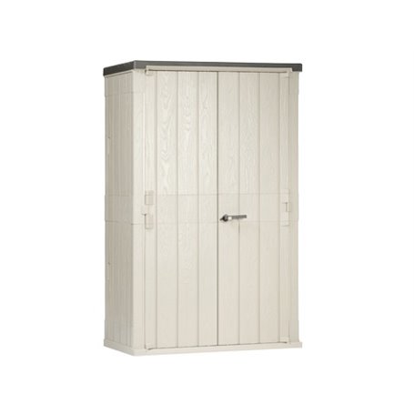 Struttura in resina, ottimale isolamento dalle condizioni esterne e raggi UV, montaggio rapido, nessuna manutenzioni, lucchettabile, pavimentazione inclusa. Dimensioni L130xP75xH206 cm.