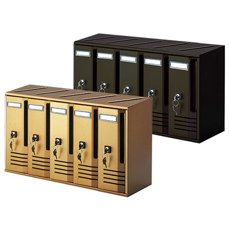 Interamente in alluminio color bronzo, componibile, a quattro cassette formato riviste con introduzione della corrispondenza sia anteriormente che da feritoia superiore, con serratura a cilindro con due chiavi.