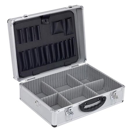 In alluminio. Con divisori e vano porta utensili sul dorso. Adatta per elettricisti.cm 46 x 33 x 16