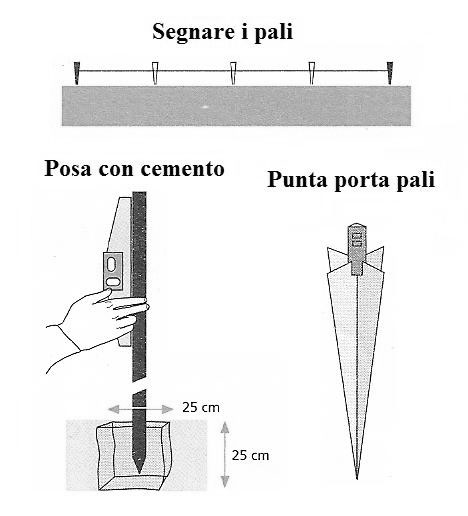 - Volendo murare i pali con cubi di malta di cemento, vanno scavate delle fosse di cm 25x25x25.
