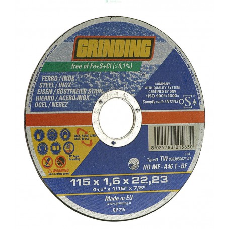 Mod. 'TW-HDMF' resinoidi rinforzate piane. Per applicazioni nell industria di acciaio inox e ferro e per il taglio di lamierati e particolari in acciaio e acciaio inox. Foro 22,2 mm Diametro 115 mm Spessore 1,6 mm
