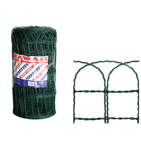 In filo d'acciaio zincato e plastificato, colore verde muschio. Maglia intrecciata 90x150 mm Filo Ø 2,4 mm / Ø 3,25mm rotolo 25 mt Altezza H cm 90