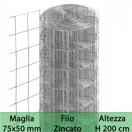 1PZ RETE PER RECINZIONE ZINCATA | ALTEZZA H 200 CM | MAGLIA ELETTROSALDATA 75X50 MM | FILO Ø 1,7 MM | LUGHEZZA ROTOLO DA 25 MT P