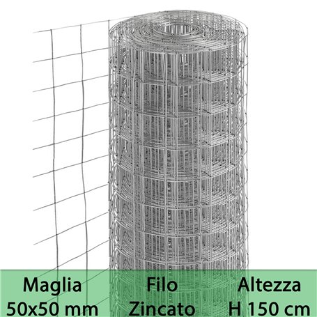1PZ RETE PER RECINZIONE ZINCATA | ALTEZZA H 150 CM | MAGLIA ELETTROSALDATA 50X50 MM | FILO Ø 1,8 MM | LUGHEZZA ROTOLO DA 25 MT P