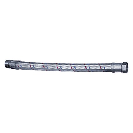 In treccia di acciaio inox, con raccordi e bussole in ottone nichelato. Interno in gomma EPDM atossica. In blister.cm 40 - M 1/2 X F 1/2 - pz.2