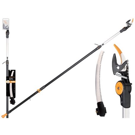 Svettatoio: Lama in acciaio bypass fino a Ø32 mm. per taglio di legno verde. Manico estensibile da 2,4 a 4 mt. per raggiungere max 6 mt. altezza lavoro. Angolo di taglio regolabile di 230°, comodo sistema di bloccaggio. Supporto della lama arancione per
