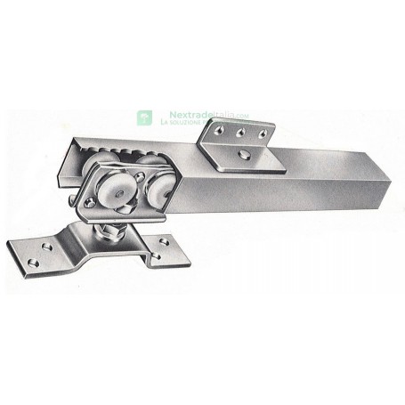 binario monorotaia in alluminio grezzo non forato da 1.500 mm.Carrelli in nylon con stop a pinze.Ruote in nylon stampato e cuscinetti a rullini.Complete di piastrina ad angolo per fissaggio a parete.Portata massima 80 kg.Per ante da 710©900 mm.
