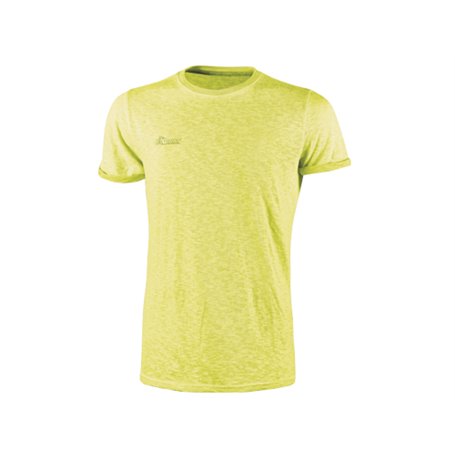 Manica corta in 100% cotone di alta qualità con filato "slub cotton†(cotone fiammato) ottenuto con fili di spessore variabile, 145 gr/mq., estremamente confortevole, traspirante, girocollo a coste. Modello Slim Fit. Colore yellow fluo
