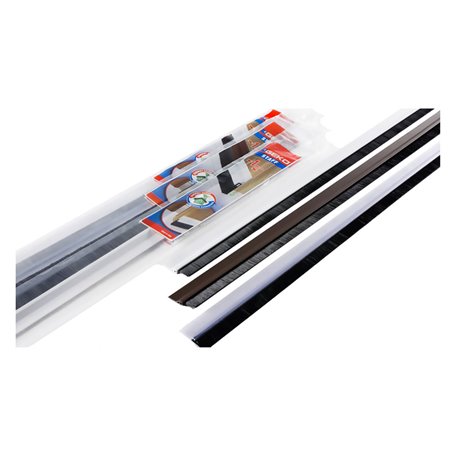 In PVC autoadesivo rigido. Con spazzola fissa, si applica sul fondo della porta. Protegge da correnti d'aria, polveri ed intrusioni di insetti. Lunghezza 1 mt. In busta.trasparente