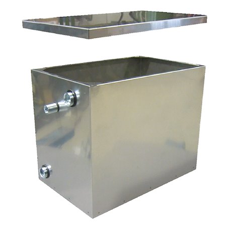 In acciaio inossidabile AISI-304. Corredato di raccorderia zincata e guarnizioni. Sigillatura ottenuta con mastice per lamiere con ottima tenuta stagna.Lt. 30 - cm. 41 x 26 x h.31