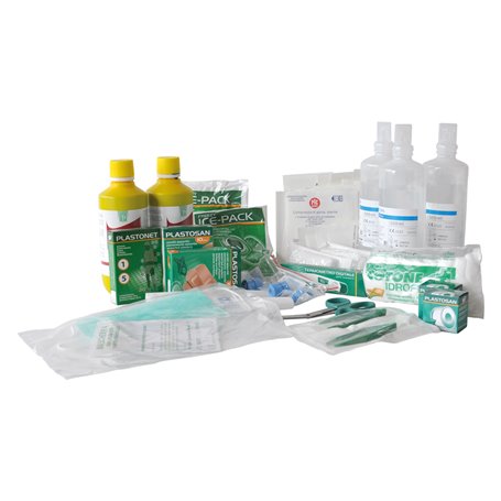 Contenuto: 1 Copia Decreto Min388, 5 paia guanti sterili, 1 mascherina con visiera paraschizzi, 3 flaconi soluzione fisiologica sterile 500 ml CE, 2 flaconi disinfettante, 10 buste compressa garza sterile cm. 10x10, 2 buste compressa garza sterile cm. 18x