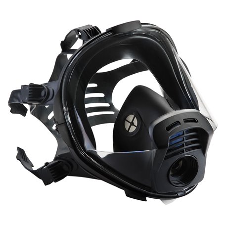 A protezione integrale. Facciale esterno in silicone, schermo panoramico in policarbonato da 2,2 mm di spessore antigraffio esterno e sistema antiappannamento interno. Mascherina in silicone anallergico. Gruppo valvolare con raccordo filettato normalizzat