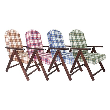 Struttura in legno di abete e faggio verniciato color noce scuro, reclinabile in 4 posizioni. Facilmente ripiegabile, trasportabile e conservabile in poco spazio. Imbottitura sagomata in spugna. Dimensioni: cm.126x60xh.21 (chiusa), cm.60x67xh.112 (aperta)