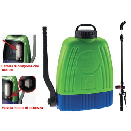 In plastica anticorrosione, pompa mano destra, capacità Lt. 16, totalmente ermetica. + PRESSIONE, la fluidità e la facilità di movimento della leva permettono un pompaggio senza fatica con un notevole risparmio di energia. + CONFORT, ergonomica e cingh