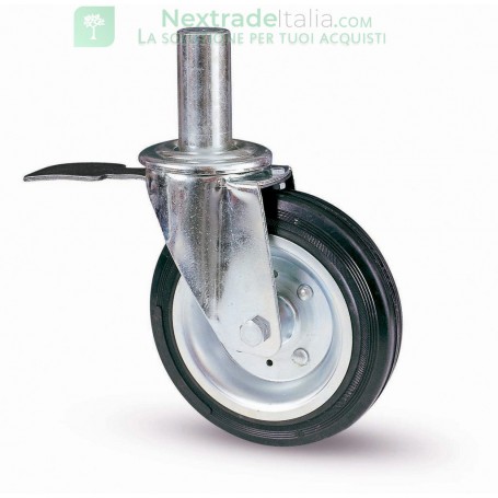 anello in gomma piena. Con cuscinetto a rulli. Supporto in acciaio stampato con piastra girevole su doppia corona a sfere e codolo ¦ 40 x h 190 mm per tubi Innocenti. Con freno. Dimensioni ruota ¦ 200 x 50 x h 232 mm. Portata max 205 kg