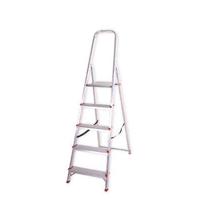 Profili in alluminio, gradini e piattaforma in acciaio zincata, telaio in tubi quadri, spigolature guarnite in plastica, piano superiore con bloccaggio di sicurezza, gradini antiscivolo, cavetto di rinforzo, arco superiore, portata massima Kg. 100. Profil