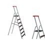 Interamente in alluminio, telaio in tubi quadri, spigolature guarnite in plastica, piano superiore con bloccaggio di sicurezza, gradini e piattaforma neri antiscivolo, cavetto di rinforzo (5-6-7-8 gradini), vaschetta portaoggetti e gancio portasecchio, po
