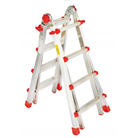 Mod. Squadra piu'. In alluminio. Utilizzabile a cavalletto, a sistema zoppo e allungata. Cerniere in acciaiao. Pioli zigrinati antisdrucciolo con passo di 280 mm. Pioli 30 x 30 mm. Uso professionale intensivo. Portata max 150 kg. A norme europee EN 131.