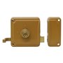 Cilindro doppio fisso: interno a 3 pistoncini ed esterno a 5 pistoncini. Scrocco e catenaccio. Scatola a finitura verniciata elettrostaticamente con polvere epossidica color nocciola. Completa di 3 chiavi in ottone nichelato, bocchetta, borchia e viti di