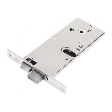 Per porte in alluminio con fascia alta. Scrocco e catenaccio, scrocco reversibile, rullo regolabile, scrocco e catenaccio nichelati, frontale in acciaio inox, cassa in acciaio zincato, foro per cilindro ovale, quadro 8. 3 MNADATE, ENTRATA 70mm, FRONTALE 2
