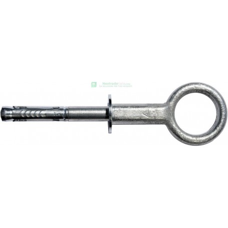 sistema composto da un golfare in acciaio diametro interno 50 mm, da una barra filettata e da un ancorante in acciaio zincocromato. Diametro di foratura 18 mm, profondità di ancoraggio 120 mm