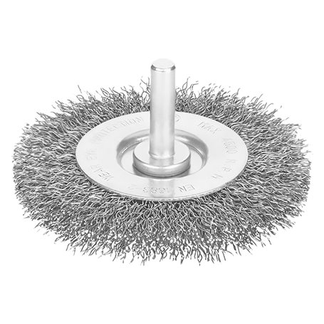 Per trapani. Ideale per la rimozione di ruggine superficiale e pulizia di mattoni. Fili in acciaio ondulato, codolo Ø 6 mm.Ø mm 100 - spessore fili 17 mm