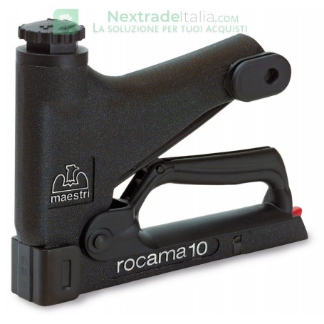 Mod. ROCAMA 10 METAL BLACK S/A corpo pressofuso in lega di alluminio-silicio. Leva in resina sintetica dura. Carica inferiore anti inceppamento. Per punti con passo 11,2 mm e altezza 5©10 mm Art. 110 per punti 105 - 108 - 110