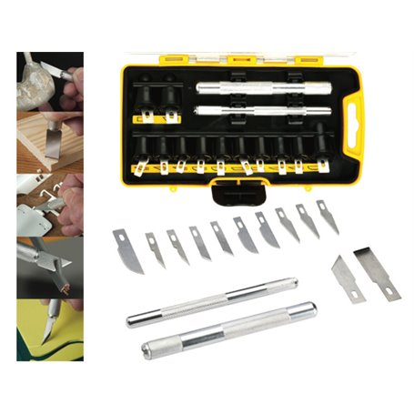Composto da 2 portalame e 12 lame (lama larga a scalpello 11 mm., lama a punta larga 11 mm., lama curva larga 8x11 mm, 3 lame ad angolo acuto cod. 11-411, 2 lame curve per sagomare cod. 11-115, 2 lame ad angolo acuto mm.4, 2 lame ad angolo di 45° 5 mm.)