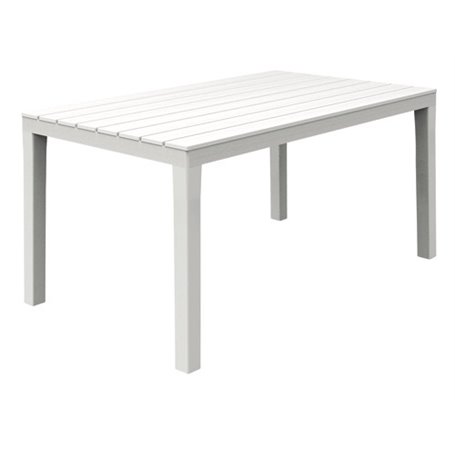 Struttura in resina resistente agli agenti atmosferici, piano effetto doghe legno. Colore bianco. Dimensioni 138x80xH72 cm.