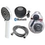 Corpo cromato in ABS. Kit composto da doccia 3 posizioni, flessibile cromo. Speaker nero bluetooth in ABS con cavetto USB per ricarica.