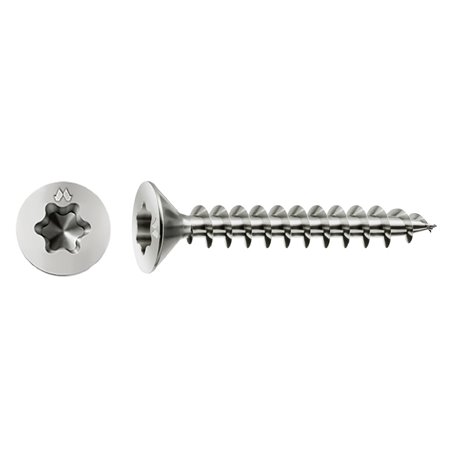 In acciaio con trattamento di carbonitrurazione antiruggine chromiting. Totalmente filettata. A norme DIN 7505, testa svasata piana cava esalobata. Avvitamento diretto senza preforo. Le pareti verticali della cava esalobata consentono di trasmettere inter