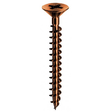 Mod. PANELVIT½ in acciaio bronzato. Per legno e pannelli truciolari, tasselli e lamiere sottili. Lubrificate Lubex. Taglio a croce PZ. Testa svasata piana. Diametro 2.5 mm Lunghezza 12 mm