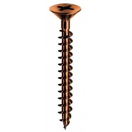 Mod. PANELVIT½ in acciaio bronzato. Per legno e pannelli truciolari, tasselli e lamiere sottili. Lubrificate Lubex. Taglio a croce PZ. Testa svasata piana. Diametro 4 mm Lunghezza 30 mm