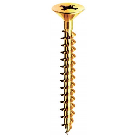 Mod. PANELVIT½ in acciaio ottonato. per legno e pannelli truciolari, tasselli e lamiere sottili. Lubrificate Lubex. Taglio a croce PZ. Testa svasata piana. Diametro 4 mm Lunghezza 25 mm